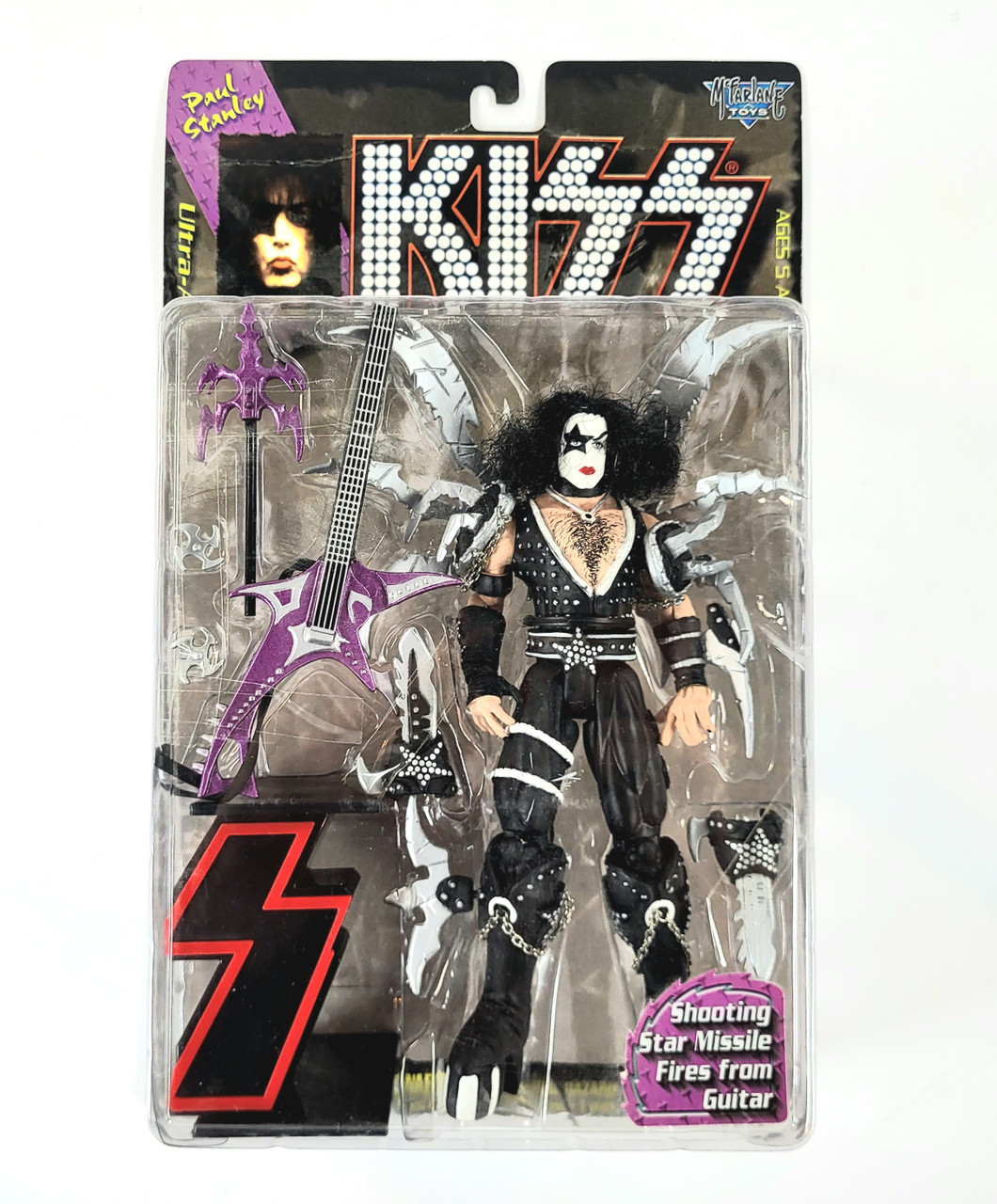 KISS McFarlane Ultra Action figure from 1997. The first production run can be identified by the photo on the upper left corner of the header card. The second production run had an updated photo of the corresponding band member holding his individual figure. This is the first edition.