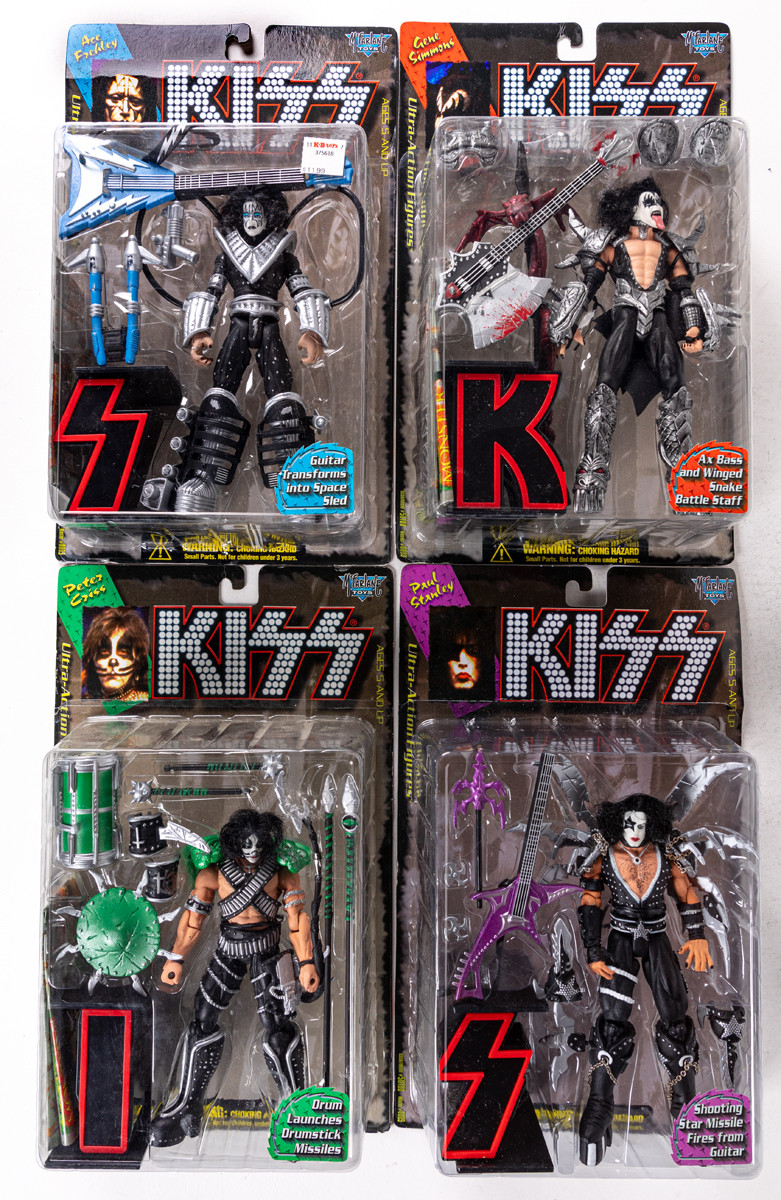 KISS McFarlane Ultra Action figure set from 1997. First production run that can be identified by the photo on the upper left corner of the header card. The second production run had an updated photo of the corresponding band member holding his individual figure.